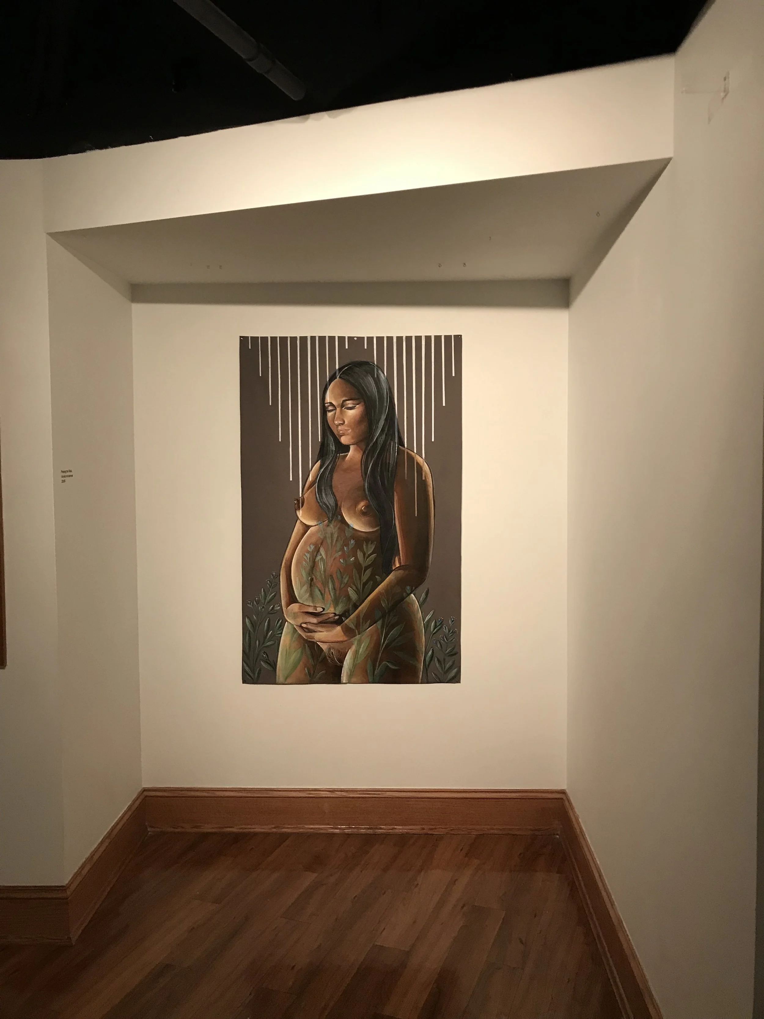 In Diné bizaad, the Navajo language, the term ni´ hoosdzáán refers to the Land being ready to provide life. For her exhibition in LookOut! Gallery, artist Nanibah Chacon exhibits a suite of paintings that treat the feminine body as both – playing on terms from Western art history – a figure and a ground, as an object of reverence and as the basis for new life. Ni´ hoosdzáán is Chacon’s first university exhibition in the Great Lakes region. The exhibition includes eight paintings, as well as preparatory drawings for murals, including the one she created while in residence with MSU’s Womxn of Color Initiative. The exhibition also includes a new work that Chacon designed for the LookOut! Gallery windows and a limited-edition risograph publication that was collectively created as part of a drawing workshop Chacon facilitated in the Residential College in the Arts and Humanities.